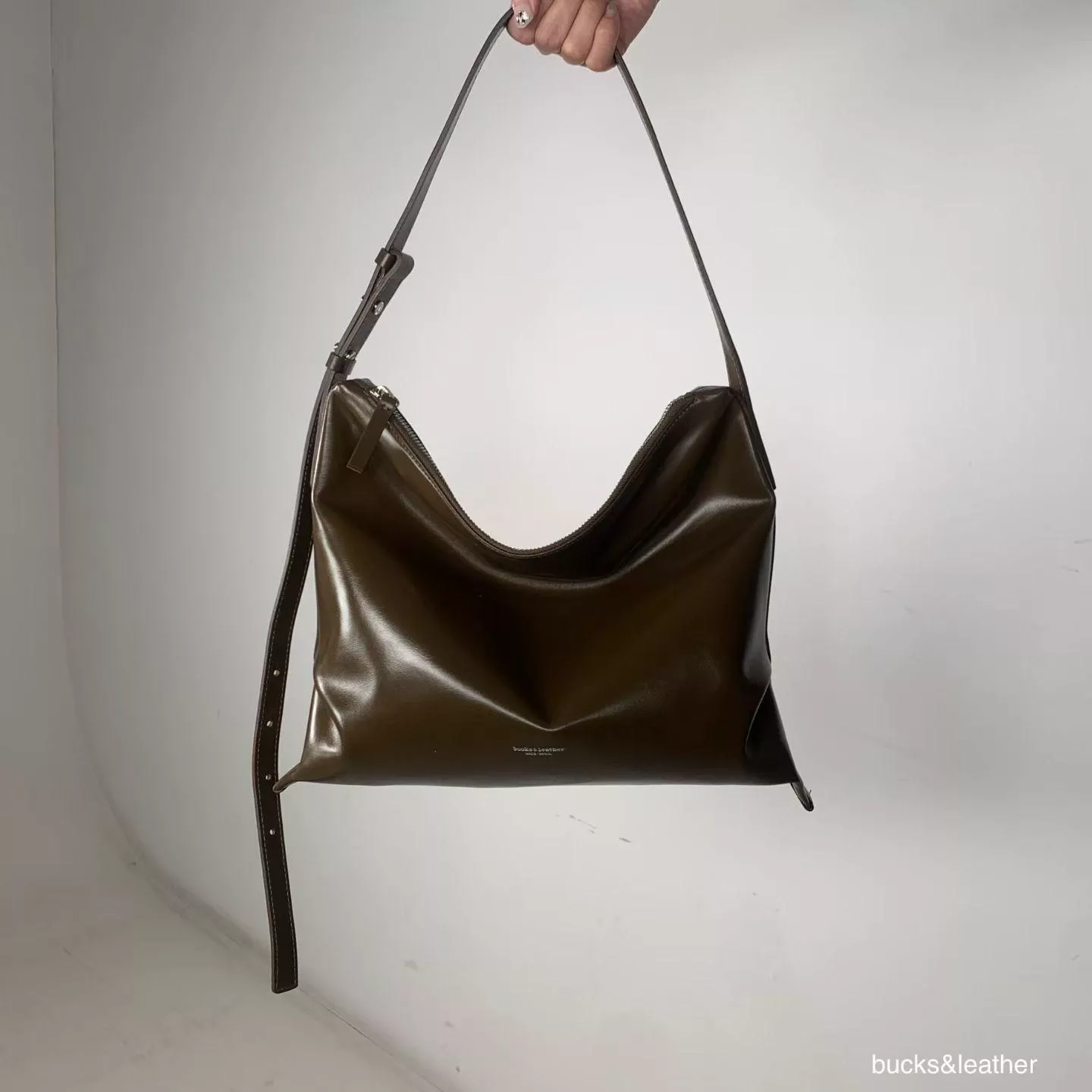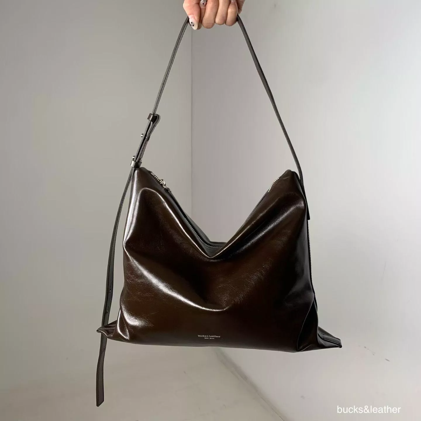 Bucks & Leather 慵懶拉鍊包 (L) - 小羊皮-黑&深咖/ 亮牛皮-黑